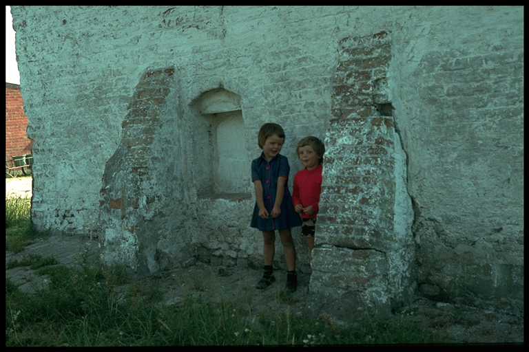 Een lage muur moet de varkens die los rondlopen op het erf buiten het woonhuis en weg van kleine spelende kinderen houden.