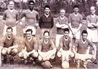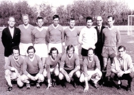 Staande: "Fritz" (een van de vrienden overgehouden aan de contacten met Mönchengladbach), Albert Naert, Gilbert Van Coillie, Reginals Boey, Theo ?, Marcel Debedts, Marcel Meyers en Willy Sanders.