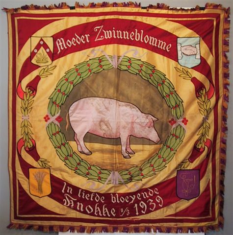 Beschrijving: Gele vlag met rood kader en centraal de afbeelding van een roze varken op een groene achtergrond in een rozenkrans. In de buitenhoek, in de richting van de wijzers staan: een handdruk, het symbool van de vereniging, een korenhalm en een wapenschild. Tussenin staat boven de tekst "Moeder Zwinneblomme" en onderaan de tekst "In liefde bloeyende Knocke a/z 1939", in roze letters op een rode achtergrond.