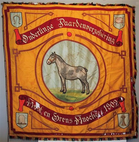 Onderlinge Paardenverzekering Kust en Grens Knocke 1902 - Vlag uit 1902 - Geschonken door Harold Van Eeckhoutte in 1999 - Formaat: 174x177 cm