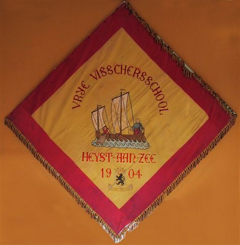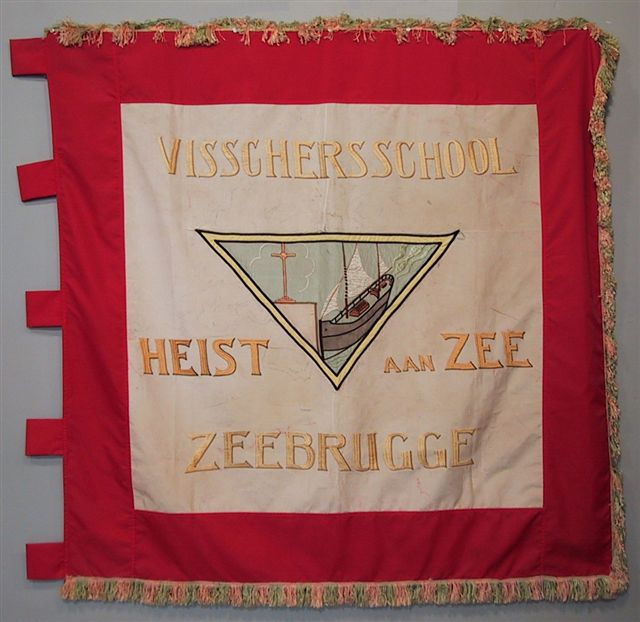 Vrije Visserijschool Heyst-aan-Zee 1904 - Vlag uit 1904 - Geschonken door Gustaaf Vermeille in 1986 - Formaat: 150x157 cm - strikbreedte 13 cm
