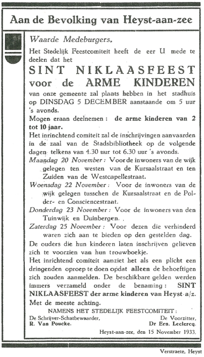 Het document opgedrukt hierboven brengt ons terug naar het "Sint Niklaasfeest voor Arme Kinderen“ van 5 december 1933, Maar in 1933 was het niet de eerste en ook niet de laatste keer dat er te Heist sinterklaasfeest voor arme kinderen werd geprogrammeerd. ‘t Was allemaal begonnen na de eerste wereldoorlog en heeft geduurd tot aan wereldoorlog nummer twee.
