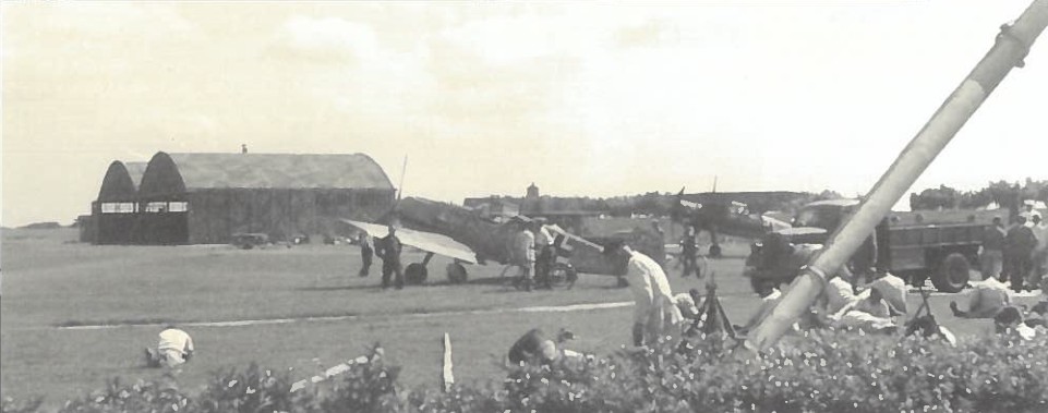 Vergroting voorgaande foto. Rechts van de vliegtuigloods staat een ‘Opel Blitz’ stafwagen van de Luftwaffe die een eigen wagenpark had op ieder vliegveld, en we zien daarnaast nog net het staartstuk en de rechtervleugel van een Duitse laagdekker. Het is de ‘Junkers 34’ die gebruikt werd voor het slepen van luchtdoelen. De antennes van de Ju 34 zijn duidelijk te zien, dit toestel werd neergeschoten op 17 september 1941 door Britse toestellen. De piloot vloog op te lage hoogte en zijn valscherm ging niet meer open, zodat hij 2 meter diep in de grond sloeg zoals getuigen later vertelden.