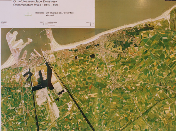 Foto links: Orthofotoassemblage Zwinstreek, 1989-1990 - Eurosense Belfotop Kaart rechts: Zeebrugge 5/5 Noord, 1995 - Nationaal Geografisch Instituut, schaal 1/10.000