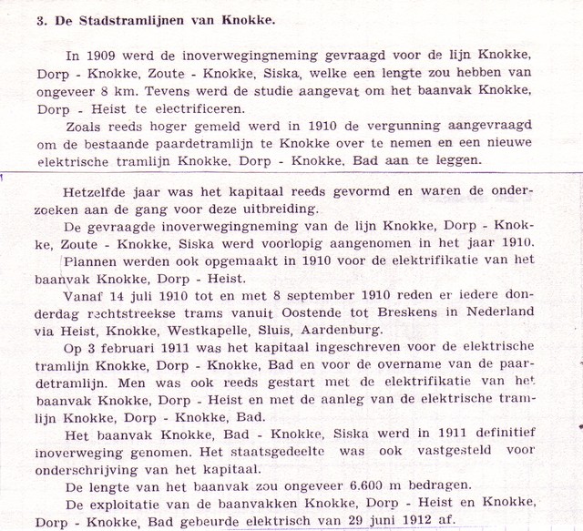 De lijn Oostende-Blankenberge was al geëlektrificeerd in 1909. Het stukje tussen Heist en Knokke werd nog door de stoomtram bediend. In Knokke reed dus een stoomtram én een paardentram. In februari 1912 maakte de NMVB plannen om de paardentram over te nemen en te vervangen door een elektrische tram. Vier maanden later, op 29 juni 1912 reed de eerste elektrische tram vanaf Oostende Knokke binnen tot aan het Zoute.